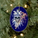 Der Jester-Schädel im Mardi Gras-Stil trägt eine Maske im New Orleans-Stil in Blau- und Silberweiß und trägt einen goldenen Schädel Jester-Zepter.