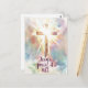 Die Osterpostkarte zeigt ein schönes Holzkreuz in Aquarelltönen mit abstraktem Hintergrund in Blau, Rosa und Weiß. Es zeigt den Titel eines Christlichen Hymns: "Jesus hat alles bezahlt." Der Gruß, das Gebet kann für eine handgeschriebene Nachricht personalisiert oder gelöscht werden.