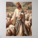 Diese ruhige Abbildung erfasst das Wesen Jesu als des guten Hirten und verkörpert Liebe und Fürsorge. Jesus ist in einem dreiviertel Ausblick dargestellt und zentral positioniert, in einem fließenden, weißlichen Gewand gekleidet. Seine mittelalterlichen Merkmale mit hellbraunem Haar, einem Bräunungskomplex und einem Bart strahlen Wärme und Demut aus. Er hält ein Lamm in einem Arm und ein Hirtenstab in dem anderen und beobachtet seine Herde zärtlich. Schafe in unterschiedlichen Tönen von hellbrauner und bräunlicher Wolle verstreut sich über eine üppige, pastorale Landschaft mit sanften grünen Hügeln und lebhaftem Laub. Oben wird das ruhige Ambiente durch einen zarten blauen Himmel mit verstreuten Wolken noch verstärkt. Die diffuse Beleuchtung vervollständigt die friedliche Szene durch sanfte Lichter und Schatten. Inspiriert von traditioneller religiöser Kunst, ist dieses Stück reich an Farbe und Details, was ein Gefühl von Glauben, Mitgefühl und Hingabe hervorruft. Dieses Kunstwerk ist perfekt für diejenigen, die eine sinnvolle Darstellung der Rolle Jesu als Beschützer und Führer suchen, und dient als eine beruhigende Erinnerung Seiner unerschütterlichen Liebe und Fürsorge. Es ist eine zeitlose Ergänzung zu jedem Raum oder ein nachdenkliches Geschenk für jemanden, der seinen Glauben liebt.