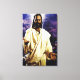 Jesus grüßt dich, die Leinwand hat Jesus mit seinen Armen offen für dich, mit einem blauen grauen Himmelshintergrund.Und er hat ein weißes Outfit auf.