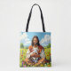 Christian religious tote bag with an ai illustration of Jesus Christ holding a lamb and smiling.