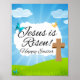 Feiern Sie die Jahreszeit der Erneuerung und der Frühlingserfrischung mit dieser inspirierenden, religiösen Christlichen Osterartikel mit einer Botschaft. Jesus Christus ist auferstanden! Farbenfroher Himmel im Freien, grünes Gras und weiße Puffwolken-Szene mit einem Holzkreuz, um die Auferstehung Christi nach der geliehenen Saison zu zeigen. Ideal für die Ostereierjagd in der Kirche.