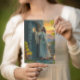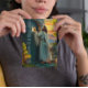 Ein bärtiger Jesus steht in einem weißen Gewölbe, mit langen, fließenden Haaren und reicht zur Touch ein rechteckiges Fenster auf einer Steintür. Sein sanftes Klopfen wartet auf eine Antwort, die eine Einladung zum spirituellen Erwachen symbolisiert. Der Rahmen ist eine ruhige Landschaft während des Sonnenuntergangs, mit lebhaften Farben in Orange, Gelb und Rosa am Himmel. Der Mann steht auf einem steinernen Weg, der bis zur Tür führt und von üppiger Vegetation umgeben ist, darunter Bäume und Gras. Die Türe selbst ist ein Set in einem Steingewölbe, und die ganze Szene strahlt ein Gefühl von Rätsel und Wunder aus.