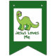Fügen Sie eine Flaggenfahne Dinosaurier-Party Ihr Kindes, das "Jesus-Lieben ich" mit zusammenpassenden Schalen, Teller, Servietten sagt, und mehr hinzu!