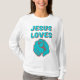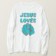 Der lange Ärmel dieser Frau hat eine blaue Hand mit einem Zeigefinger und einer Kontur mit rotem Schatten, in der die Worte "Jesus Lieben" in einem fett gedruckten Schriftart mit dem passenden Schattenkontext im konfessionsbasierten Zitat angezeigt werden. Dieser Tee ist bequem, lässig und locker, aus 6,0 oz, 100% Baumwolle vorschrumpfend, mit doppelnadelgeheftetem Boden und Ärmelhemen für extra Haltbarkeit, passen und tragen unsere T-Shirts gut auf allen und allen.