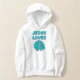 Dieser Mädchenjunge hat eine blaue Hand mit einem Zeigefinger plus einer Kontur mit rotem Schatten, die in einem fett gedruckten Schriftart die Worte "Jesus Lieben" mit dem passenden Schattenbild im Zitat-Thema zeigt. Diese Kapuze besteht aus einer 10-oz-Baumwolle-Poly-Mischung aus 100% Set-in-Ärmeln und doppelnadelgesteppten Armlöchern und dem unteren Band für mehr Haltbarkeit mit einem kleineren passenden Bild auf der Rückseite.