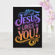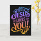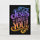 Dieses kühne und aufmunternde Design zeigt die Botschaft „Jesus liebt dich!“ in auffallender, vintage-inspirierter Typografie. Vor einem tiefschwarzen Hintergrund kommt die Schrift durch einen lebendigen Farbverlauf zum Leben, der von kühlen Blautönen und Purpurrot am oberen Ende zu warmen Orangetönen und goldenen Gelbtönen am unteren Ende verläuft. Elegante Schnörkel und dekorative Schwünge verleihen dem Stück ein klassisches, handgefertigtes Gefühl, während der starke Kontrast und die strahlende Farbe ihm eine moderne, augenfällige Energie verleihen. Das Gesamtdesign ist sowohl zeitlos als auch freudig – perfekt, um Ermutigung, Glauben und positive Energie zu teilen.