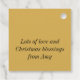 Dieses Geschenk-Tag zeigt eine schöne Anordnung der biblischen Geschichte von Jesus' Geburt einschließlich der Stern über dem Stall. Der Nachthimmel ist ein tiefblau mit Sternen bedeckt, der einem goldenen Boden, der eine blaue goldene Ästhetik verleiht, gegenübersteht. Optionaler "Frohe Weihnachten"-Text und eine Vorlage wurden bereitgestellt, um Ihren Nachrichtennamen und/oder anderen Text auf der Rückseite hinzuzufügen.