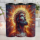 Dieses mächtige Portrait zeigt Jesus Christus mit einem kontemplativen Ausdruck, der nach oben schaut, während er eine Dornkrone trägt. Sein Gesicht wird durch einen strahlenden Hauch goldenen Lichts beleuchtet. Der Hintergrund ist ein dramatischer und feuriger Wirbel aus orangen und roten Farben, der ein Gefühl von göttlicher Energie und spiritueller Intensität schafft.