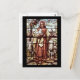 Ein Vintages Buntglas in mehreren Farben. Jesus steht mit seinem Stab, der ein Lamm hält, während zwei andere Schafe Ihn sehen