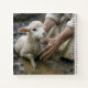 Ein zartes Lamm in einer Schlammpfütze, während es von den Händen eines Hirten sanft gerettet wird.