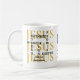 Stilvolle Christliche Kaffee-Tasse mit einigen der beliebten Beschreibungen des Herrn in einem Kreuzworträtformat in fett schwarzer Typografie dargestellt. Im Hintergrund wird der Name Jesus dreimal in goldfarbenem Serif-Schriftart wiederholt. Das Design wird auf der Rückseite wiederholt. In der Mitte befinden sich Platzhalter und ein Monogramm, die anpassbar sind, sodass Sie Ihren Namen und Ihren Initial hinzufügen oder Ihren eigenen Text erstellen können. Dies wäre ein großes Geschenk für Geburtstage, Weihnachten und für jeden, der die folgenden inspirierenden Zitate auf der Grundlage der Bibelschrift Liebe: Gott wird einen Weg in die Wüste machen; Gott behalte immer seine Versprechen; Jesus ist das Licht der Welt, und Gott ist einer, der Wunder macht.