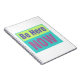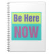 "Be Here Now" in Blau, Rosa. Gelb und Aquamarin auf einem ausgekleideten Tagebuch oder Notizbuch.