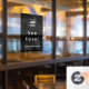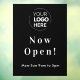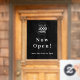Ein modernes, schwarzes Firmenlogo, das mit Vinyl-Fensterkleber und klassischer Typografie im minimalistischen Stil geöffnet wird. Die Vorlage kann einfach mit Ihrem Firmenlogo und Geschäftszeiten aktualisiert werden.