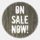 In diesem runden Aufkleber-Verkaufsdesign steht die Meldung "JETZT IM VERKAUF!". Es verfügt auch über ein Imitat Holz-Hintergrund. Es könnte in einem Einzelhandelsgeschäft verwendet werden, um Waren zu kennzeichnen, deren Preis gesenkt wurde.