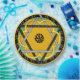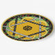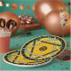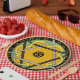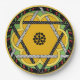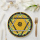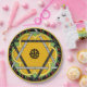 Ein fröhliches, originelles Design mit einer zentralen Mandala, die eine dunkelgelbe Blume mit einem Polka Punkt Stern von David alles Set auf einem grünem Frühlingshintergrund verbindet, eine Grenze von roten Kirschen & grünen Blätter gegen schwarz und eine letzte Grenze von Stangl gelb. Ideal für Party im Freien, für Familienfeiern oder Teller zum Mittag.