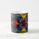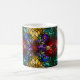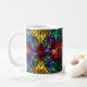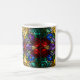 This coffee mug showcases a stunning, abstract stained glass mosaic design, bursting with vibrant jewel tones. The pattern features an intricate floral mandala of rich ruby red, deep amethyst purple, emerald green, and sunny gold, all framed by elegant black solder lines. The luminous, repeating motif makes every sip feel special. This beautiful, artistic mug is the perfect gift for art lovers, mosaic enthusiasts, or anyone looking to add a touch of colorful sophistication and handmade aesthetic to their morning routine.
