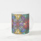 This coffee mug showcases a stunning, abstract stained glass mosaic design, bursting with vibrant jewel tones. The pattern features an intricate floral mandala of rich ruby red, deep amethyst purple, emerald green, and sunny gold, all framed by elegant black solder lines. The luminous, repeating motif makes every sip feel special. This beautiful, artistic mug is the perfect gift for art lovers, mosaic enthusiasts, or anyone looking to add a touch of colorful sophistication and handmade aesthetic to their morning routine.