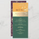 Einfach, kalligrafisch, modern, elegant, Schmucktöne, smaragdgrün, gelb und pflaumenfarbenes lila Hochzeitsmenü mit vergoldeter goldblühender Spitze.
