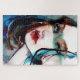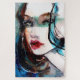 Originelle Porträtkunst - farbenfrohe Aquarellbilder und Farbmalerei eines schönen Models mit roten Lippen auf blauem Hintergrund. Schönes, stilvolles Geschenk für einen Beauty- und Modeliebhaber!