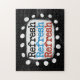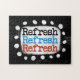 Ein niedliches typografisches Design, das "Refresh Refresh Refresh Refresh" sagt. Es ist schwarzer, roter und blauer Text auf einem weißen Rechteck mit funky, spielerisch weißen Punkten, die ihn umgeben, alles auf einem schwarzen Hintergrund.