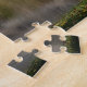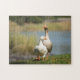 Anpassbare Puzzle von zwei Gänsen, die am frühen Morgen am Fluss entlang des Grases spazieren.