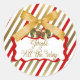 Jingle All the Way Round Aufkleber verfügen über einen goldenen Bogen mit zwei goldenen Jingle Gells auf einem Hintergrund aus roten, weißen und goldenen diagonalen Streifen mit einem rot-weißen Banner mit Goldtext, der Jingle All the Way liest. Wir haben passende Umschläge, Grußkarten, Labels und Briefmarke für den Versand!