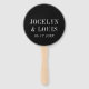 Moderne Hochzeitshandfans mit minimalistischem Schwarz-Design mit Ihren Namen in einem großen Schriftart und Ihrem Hochzeitsdatum. Der Rücken hat Ihre personalisierte Danksagung. Dieses Design ist einfach genug für eine feierliche Hochzeit, aber macht eine kühne Aussage.