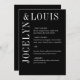 Modernes Hochzeitsmenü in minimalistischem Schwarz-Design mit Ihren Namen in einem großen Schriftart entlang der links Seite und oben. Dieses Design ist einfach genug für eine feierliche Hochzeit, aber macht eine kühne Aussage.