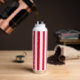Reiten Farben Stil Wasserflasche mit einem klassischen Streifen Muster in rot und weiß. Dieses vertikale gestreifte Muster ist eines der traditionellen Jockey Seidenmuster oder Rennfarben, um den Stall bei Pferderennen zu kennzeichnen. Eine tolle Geschenkidee für jeden Pferderennsportler, Jockey, Besitzer oder Trainer oder ein lustiges, praktisches Accessoire für jeden Tag oder Pferderennen. Rot und weiß, aber Farben können im Designwerkzeug angepasst werden.