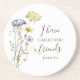 Runder Sandstein-Untersetzer mit inspirierender Zitatskriptur zeigt eine wunderschöne Naturwasserfarbe mit schlichten blauen und gelben Wildblumen auf der Wiese. Es zeigt einen Teil eines ermutigenden Bibelverses John 15:15, in den Worten Jesu: "Ich habe dich Freunde genannt."