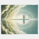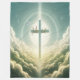 Weich blaues Kreuz zwischen flauschigen Wolken mit goldenem Typografie-Design.