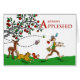 Happy Johnny Appleseed Day, Papier Grußkarte. Die Karte zeigt eine niedliche Darstellung von Johnny Appleseed, der eine Menagerie von Tieren und Insekten leitet, während er Apfelsamen auf dem Boden verteilt. Hinter ihnen liegt ein großer Apfelbaum mit roten Äpfeln. Art, Bild und Vers Copyright © Shoaff Ballanger Studios.