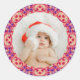 Jolly und Festivals Rot, Gelb und Lila Weihnachts Foto Bilderrahmen Rund Scrapbooking Sticker Dekoration. Ein farbenfroher und leuchtend kreisförmiger Foto Aufkleber für Ihre maximalistischen winterthematischen Scrapbook-Dekorationen. Das Rahmendesign ist ein fröhliches geometrisches Abstraktionsmuster, das traditionelle festliche Farbblockdesigns annimmt. In kontrastfarbenen Rot-, Gelb- und lila Farben mit Hellgrün. Personalisieren Sie es, indem Sie das Foto mit Ihrem eigenen ersetzen, für ein frühes Geschenk für Familie und Freunde zu feiern Weihnachten. Zieh deine Yuletide-Erinnerungen eines Winterwunderlandes. Ein tolles Geschenk für die besten Freunde, Brüder und Schwestern, Paare, Eltern und Großeltern, die Liebe zum Handwerk und Scrapbook oder zum Sammeln von Foto-Alben. Ein preisgünstiger Sake für Feiern, erste Feste oder Erntedank.