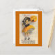 Eine schöne Vintage Halloween-Karte zeigt ein kleines Mädchen in Gelb und Schwarz, das von einem Kürbisgesicht überrascht wird.