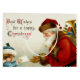 Nostalgisches Bild eines rot-roten Weihnachtsmannes aus der Viktorianischen Zeit, der eine Tüte Spielzeug trägt, das einen Brief von einem schüchternen Kind in blauer Mantel und Hut bekommt.