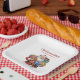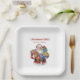 Papier Teller mit einem niedlichen Weihnachtsbild. Ein traditioneller Weihnachtsmann in seinem klassisch roten Outfit. Seine Arme voller Geschenke. Bereit, Geschenke für alle zu bringen.