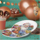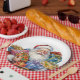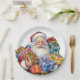 Papier Teller mit einem niedlichen Weihnachtsbild. Ein traditioneller Weihnachtsmann in seinem klassisch roten Outfit. Seine Arme voller Geschenke. Bereit, Geschenke für alle zu bringen.