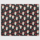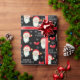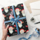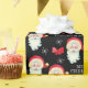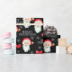 Dieses Weihnachtsgeschenkpapier zeigt eine Grafik des Weihnachtsmanns und ist mit Bögen und Schneeflocken auf dem schwarzen Hintergrund akzentuiert.