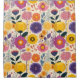 Ein buntes Blumenmuster mit kaskadierenden, spielerisch gelben, lila und orangefarbenen Blume auf cremefarbenem Hintergrund.