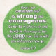Zeigen Sie stolz Ihren Glauben mit diesem fantastischen Untersetzer! Weiße Buchstaben zeigen die Wörter von Joshua-1:9 auf einem grünen splattered Hintergrund an. Ein großer Ermutigungs-Vers.