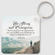 Der inspirierende Schlüsselanhänger der individuellen Schrift zeigt eine Person, die auf einem Weg über einem wunderschönen Bergtal spaziert. Es zeigt Bible Verse Joshua 1:9, "Sei stark und mutig. Fürchte dich nicht; lass dich nicht entmutigen, denn der Herr, dein Gott wird bei dir sein, wohin du auch gehst." _