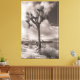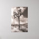 Ein einsamer Joshua-Baum steht vor einem Hintergrund eines bewölkten Himmels in einer Wüstenlandschaft hoch. Der Baum zeichnet sich durch seine einzigartige Verzweigung und seine spitzen Blätter aus, während die umliegende Wüstenvegetation im Vordergrund sichtbar ist. Das Bild wird in Schwarz und Weiß eingefangen, was ein Gefühl von krasser Schönheit schafft und die Texturen der Wüste betont.