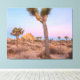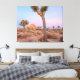 Das Bild erfasst eine ruhige Wüstenlandschaft mit Joshua-Bäumen unter einem pastellfarbenen Himmel. Ein prominenter Joshua Tree steht im Vordergrund, sein Stamm strukturiert und verzweigt in zwei verschiedene Arme. Im Hintergrund sind Felsen und mehrere kleinere Joshua-Bäume auf dem trockenen Gelände. Der Himmel wechselt von einem weichen Blau zu einem sanften Rosa, wenn die Sonne aufgeht.