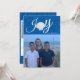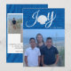 Eine Strandurlaub-Fotokarte mit einem großen Foto vorne mit dem Wort Joy. Es gibt eine Muschel anstelle des O, um ihm ein Wasserthema zu geben. Personalisieren Sie Ihre Reise mit einem Namen auf der Rückseite, 3 Fotos und einer Urlaubsnachricht.