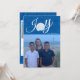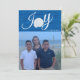Eine Strandurlaub-Fotokarte mit einem großen Foto vorne mit dem Wort Joy. Es gibt eine Muschel anstelle des O, um ihm ein Wasserthema zu geben. Personalisieren Sie Ihre Reise mit einem Namen auf der Rückseite, 3 Fotos und einer Urlaubsnachricht.