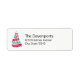 Adressetiketten mit einer lustigen und skurrilen Illustration. Typografie in Form eines Weihnachtsbaumes mit einigen Weihnachtsschmuckstücken und einem Stern darüber. Im Inneren sind die Worte: Freude an der Welt.