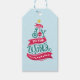 Geschenke Tags mit einer lustigen und skurrilen Illustration. Typografie in Form eines Weihnachtsbaumes mit einigen Weihnachtsschmuckstücken und einem Stern darüber. Im Inneren sind die Worte: Freude an der Welt.