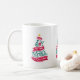 Eine Tasse mit einer lustigen und skurrilen Illustration. Typografie in Form eines Weihnachtsbaumes mit einigen Weihnachtsschmuckstücken und einem Stern darüber. Im Inneren sind die Worte: Freude an der Welt.
