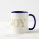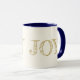 Diese Tasse hat ein mattes goldfarbenes Wort von "JOY" über weißem Hintergrund. Dargestellt mit dunkelblauem Interieur und Griff, mit dem Sie Ihre Farbe auswählen können. Passen Sie diese Tasse an oder kaufen Sie sie wie gezeigt.